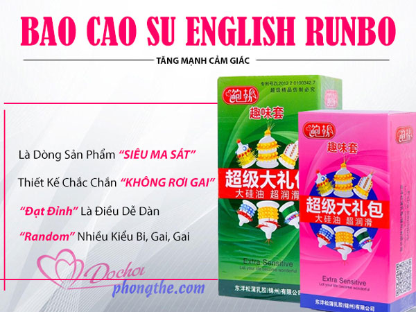 - Bao cao su gai bi râu English Runbo là dòng sản phẩm tuyệt vời giành riêng cho các cặp đôi muốn phá cách, muốn tăng cảm nhận của tình yêu, dễ dàng đạt được cảm giác thăng hoa, sung sướng nhất khi quan hệ.