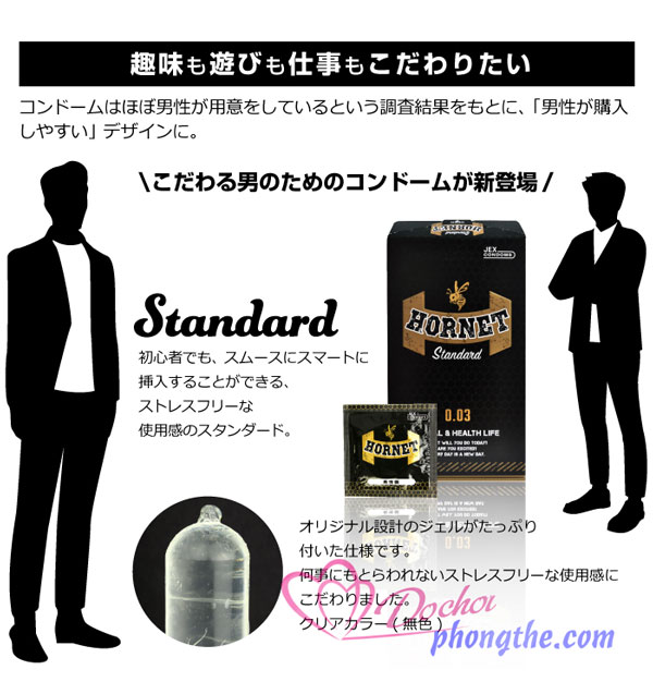 - Bao cao su Jex Hornet Standard 003mm là sản phẩm cao cấp của hãng Jex Condoms – một trong những công ty sản xuất và phân phối dụng cụ hỗ trợ tình dục hàng đầu Nhật Bản. Với thiết kế siêu mỏng đầy ấn tượng cùng kiểu dáng hiện đại, tiện dụng được ưa chuộng, Jex Hornet Standard 003 của Jex là sự lựa chọn số 1 của nhiều cặp đôi để duy trì lửa yêu trong suốt những năm tháng hạnh phúc.