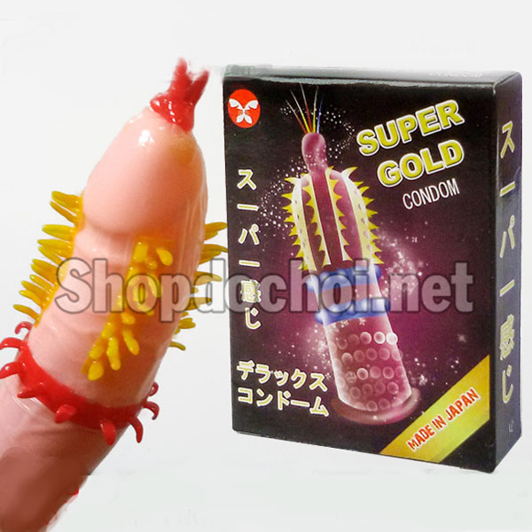 - Bao cao su Super Gold được thiết kế phần đầu bao đặc biệt có sự kết hợp rất nhiều bi, tua suốt từ đầu đến cuối bao, tạo tăng khả năng khoái cảm mãnh liệt cho bạn tình nữ khi quan hệ tình dục bởi những vòng gai bằng Silicon mềm mại.