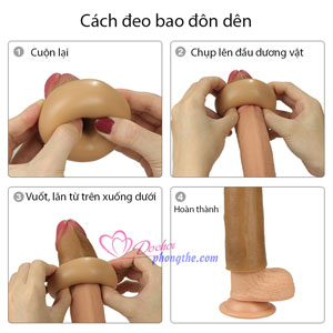 - Cách sử dụng rất đơn giản, bạn đeo một bao cao su thông thường vào trước ( bao này để chứa tinh dịch cho dễ vệ sinh) sau đó chỉ cần lộn ngược bao cao su đôn dên vào đeo theo chiều của dương vật. Có thể sử dụng gel bôi trơn giúp tăng độ ẩm và tăng khoái cảm hơn khi quan hệ. Dụng cụ này là vật dụng cá nhân không sử dụng chung với đối tượng khác đề phòng các bệnh lây nhiễm qua bộ phận sinh dục. Vệ sinh sạch sẽ trước và sau khi sử dụng đảm bảo an toàn. Bảo quản nơi khô ráo kín đáo - tránh xa tầm tay trẻ nhỏ.