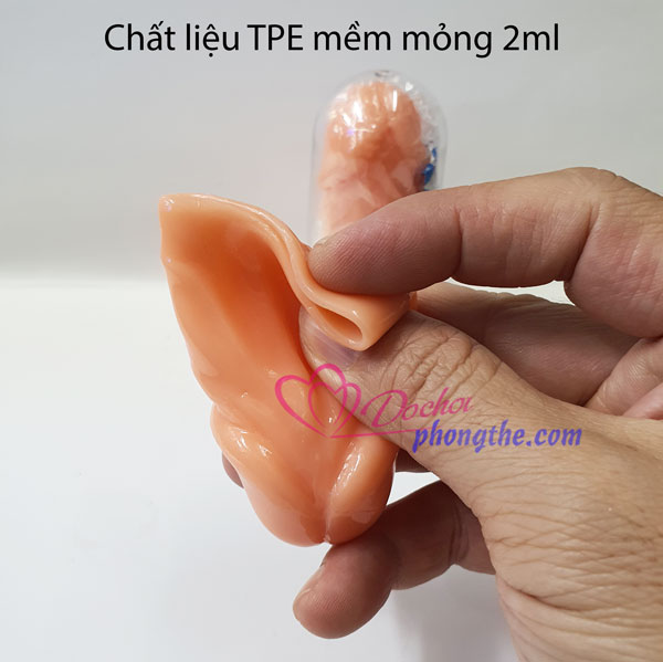 - Bao đôn đầu dương vật dài thêm 3cm được sản xuất bằng TPE y tế dành riêng để nối dài thêm kích thước Dv nên sản phẩm có kích thước, kết cấu rất đặc trưng: tổng chiều dài sản phẩm là 7.5cm; kích thước rỗng bên trong khi chưa co dãn là 3m (còn 3 cm đã được sản xuất đặc, có độ rắn như khi DV thật cương cứng)