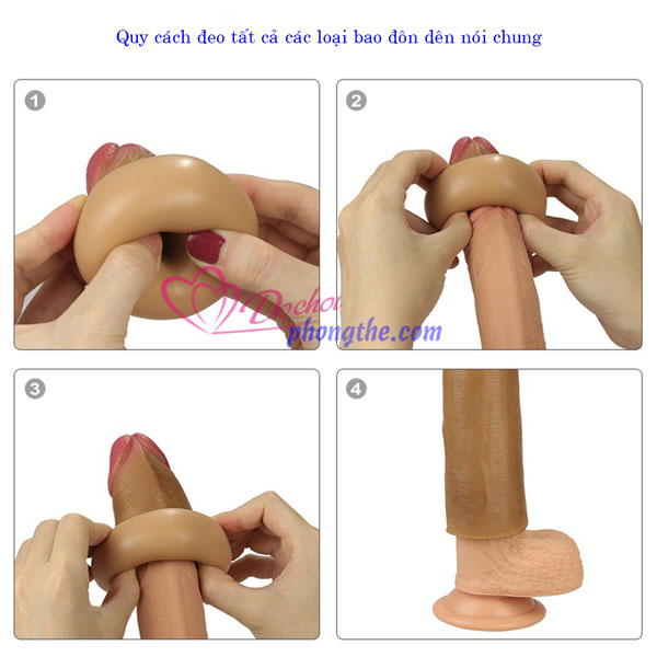 - Khi dương vật cương cứng, lộn ngược bao đôn dên lại và trùm lên phần bao quy đầu sau đó tuột ngược bao cao su đôn dên trở lại về phía gốc dương vật.