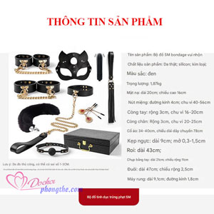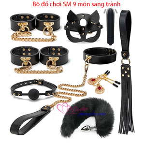 - Bộ đồ chơi SM này với 9 món là: Mặt nạ, khóa tay, khóa chân, khóa hàm, roi da,, khóa cổ có dây xích, kẹp ngực. máy rung, đuôi cáo . Tất cả được đựng trong một chiếc hộp bằng da màu đen cực kỳ sang trọng và đẳng cấp. Vừa giúp các bạn có thể làm một món quà để dành tặng cho người yêu vừa giúp những món đồ chơi có nơi để cất giữ tốt hơn.