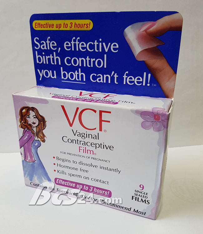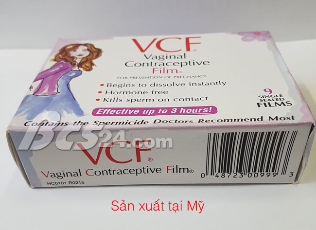 - VCF là 1 màng film kích thước 5cm X 5 cm , rất mỏng mềm và tan trong âm đạo của người phụ nữ . VCF có chứa 28% chất Nonoxyno-9 ( một loại thuốc diệt tinh trùng hiệu quả cao ) đủ để giệt tinh trùng mỗi lần giao hợp . VCF được sử dụng để tránh thai và được đặt vào âm đạo trước mỗi lần giao hợp .