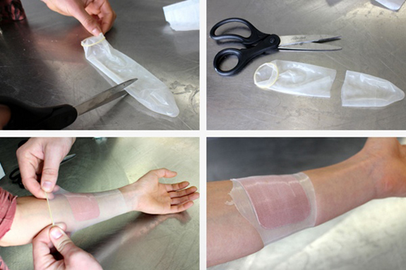 Khi bị thương, việc sát trùng, cách khuẩn là tối quan trọng. Bạn có thể không nguy hiểm vì vết thương hay vì mất máu mà nhiều khi là bởi nhiễm khuẩn uốn ván. Với độ đàn hồi đáng nể, bạn có thể biến bao cao su thành một chiếc găng tay y tế cực hiệu quả.